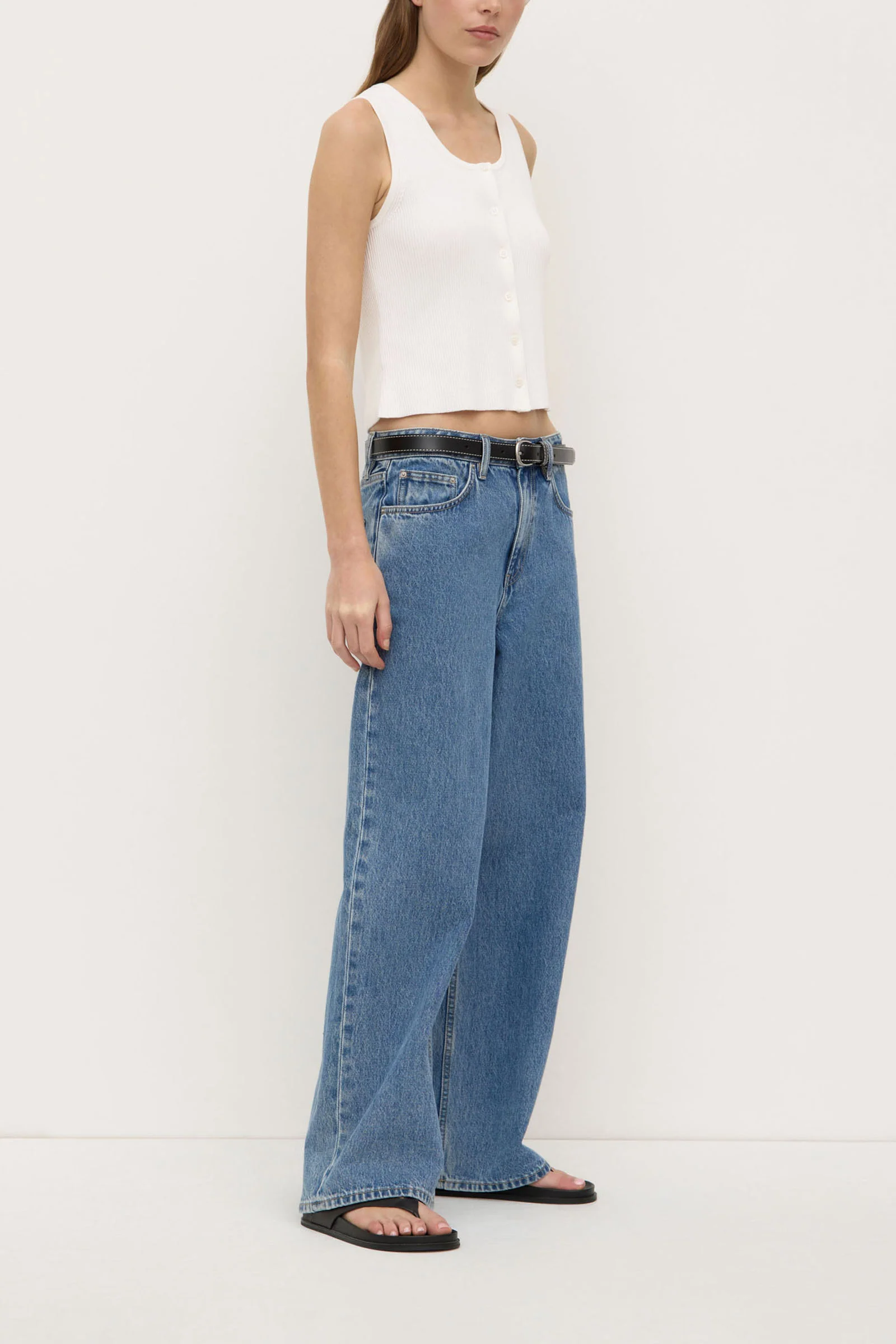 Designed for a slim fit, this sleeveless top is cut in a vest-style silhouette, featuring a button front and ribbed detailing.